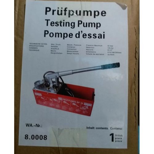 Pressure testing with water or oil of piping in residential and industrial construction and for industrial containers up to sixty bar. Expansion possible with fine scaling gauge for testing up to sixteen bar.