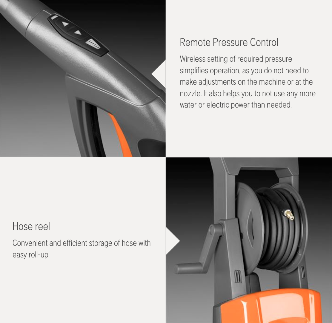 An all-round high-pressure washer with robust and purposeful design for cleaning tasks such as patios, garden furniture, fences and stone settings. Two swivel functions for nozzle adjustment and quick connection prevent hassle. On-board accessory storage, hose reel and power cord storage make operation efficient. The metal pump provides a high, reliable durability. Two nozzles and one foam sprayer are included.