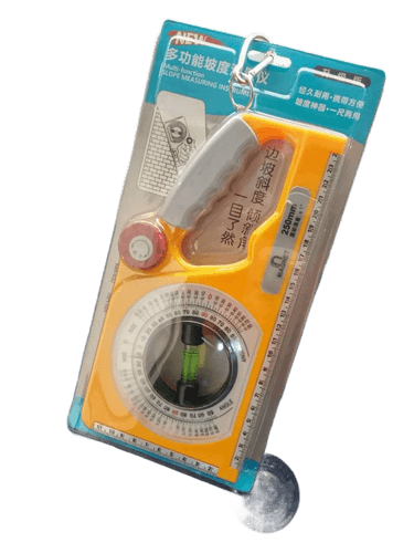 This mechanical inclinometer angle slope meter is a precision tool designed for measuring angles, slopes, rise, and fall in construction, engineering, and installation work. It features a clearly marked circular angle scale combined with a built-in bubble level for reliable, non-electronic measurement. The robust plastic body includes a comfortable handle for easy positioning and handling on site.