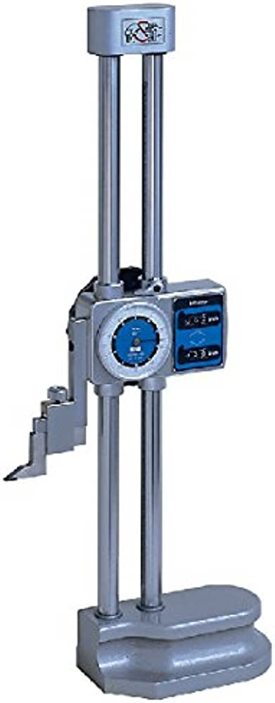 A large, hand-operated feed wheel raises and lowers the gauge on the parallel beams with smooth, even travel. The included scriber, used to mark a position on a workpiece, is 80 mm long and 32 mm high, carbide-tipped for hardness and long life, and is held to the gauge by a screw clamp for easy and secure fastening. The grip-base design provides comfort when holding the unit in position by hand. The dial and counters display large, easily-viewed figures. The mass (weight) of the height gauge is 9.8 kg.