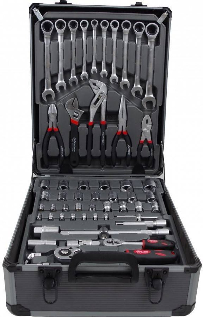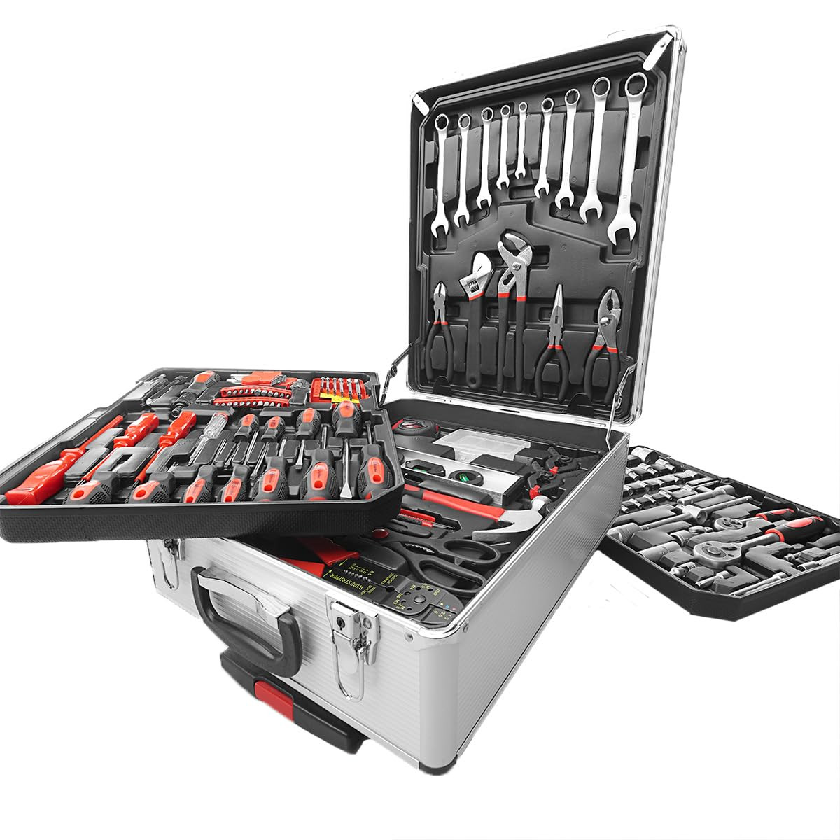 Tools are stored in a wheeled aluminum case, arranged in four removable trays. Includes screwdrivers, hex keys, pliers, metric wrenches, metric socket wrenches, a hammer and much more.