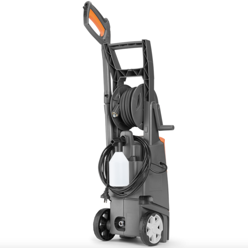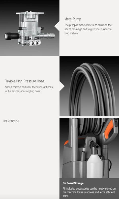 An all-round high-pressure washer with robust and purposeful design for cleaning tasks such as patios, garden furniture, fences and stone settings. Two swivel functions for nozzle adjustment and quick connection prevent hassle. On-board accessory storage, hose reel and power cord storage make operation efficient. The metal pump provides a high, reliable durability. Two nozzles and one foam sprayer are included.