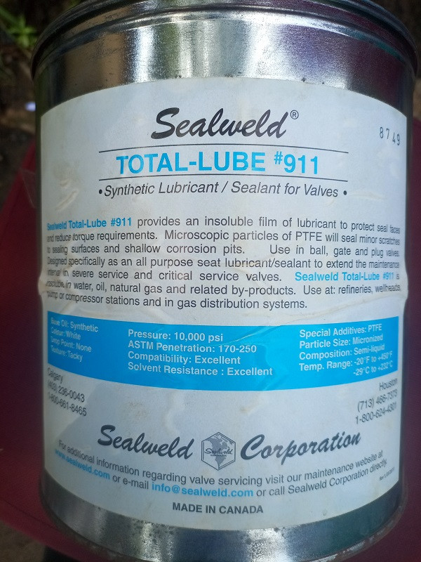 use in ball, gate, and plug valves. designed as all purpose seat lubricant/ sealant to extent the maintenance interval in severe service and critical service valves. sealweld total-lube #911 is insoluble in water, oil, natural gas and related products.